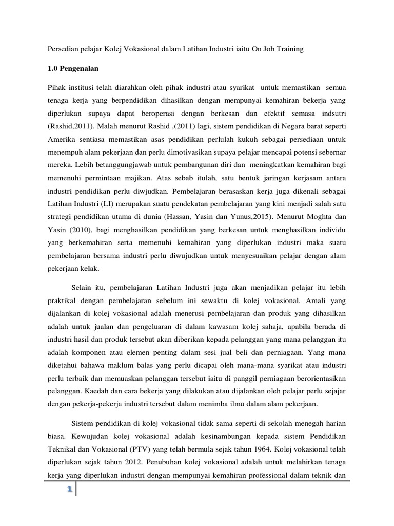 Persedian Pelajar Kolej Vokasional Dalam Latihan Industri Iaitu On Job Training Pdf
